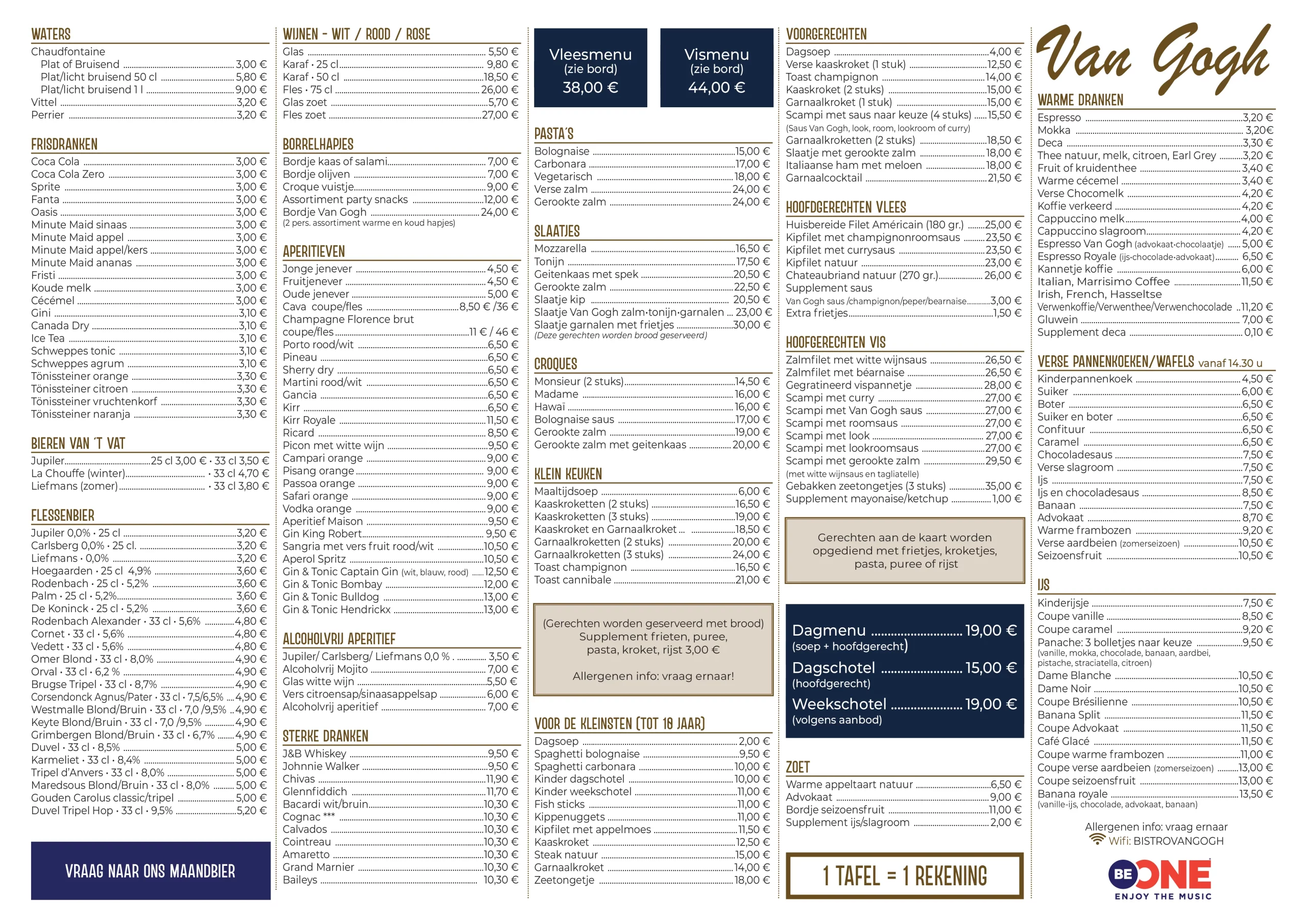 Bistro Van Gogh (tegenover supermarkt Spegelaere), met Wim als zaakvoerder, is dagelijks geopend van 9 tot 18 uur. Alleen op zondag zijn wij gesloten.